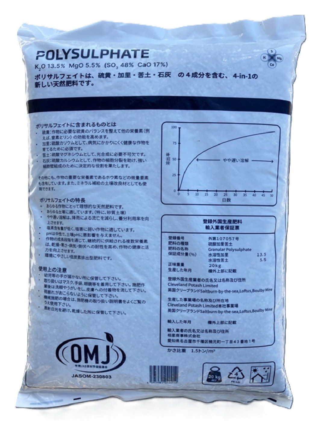 - ポリサルフェイトは天然の結晶であるため、施肥後に栄養素が徐々に溶出し、長期間可給できることにより、養分ロスの可能性を減らすと同時に、作物の養分要求にもマッチします。