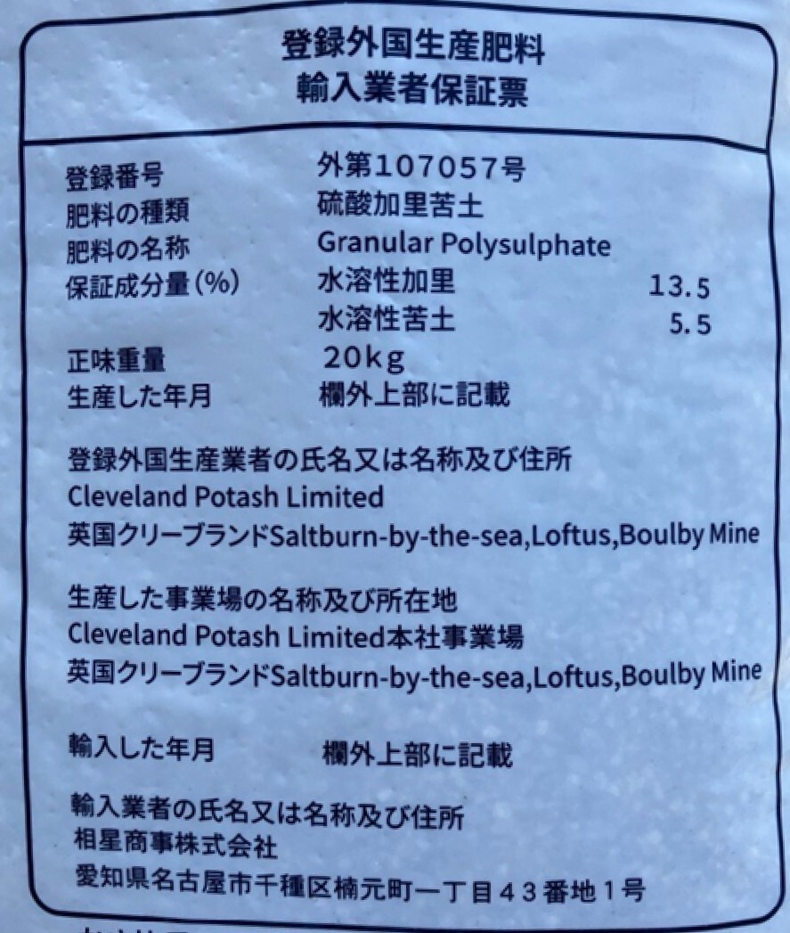 | 成分 | N0%、P0%、K13.5%、Mg5.5%、Ca17%、S48% |