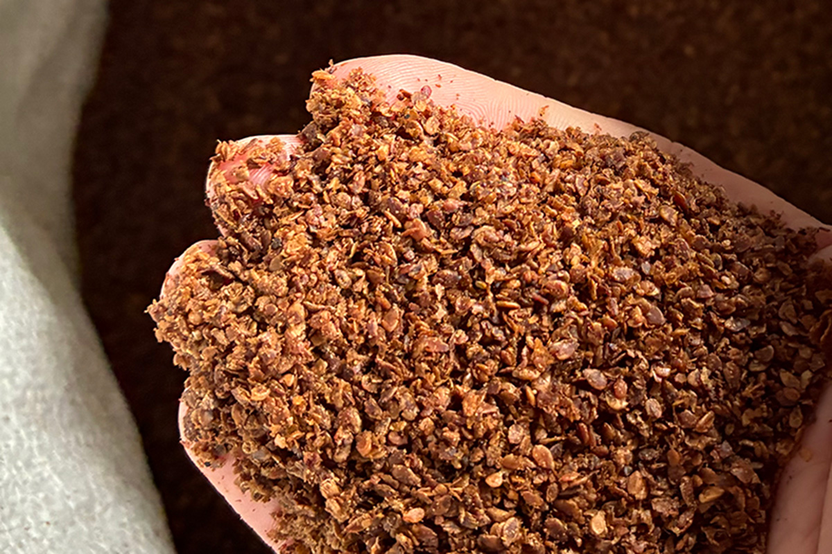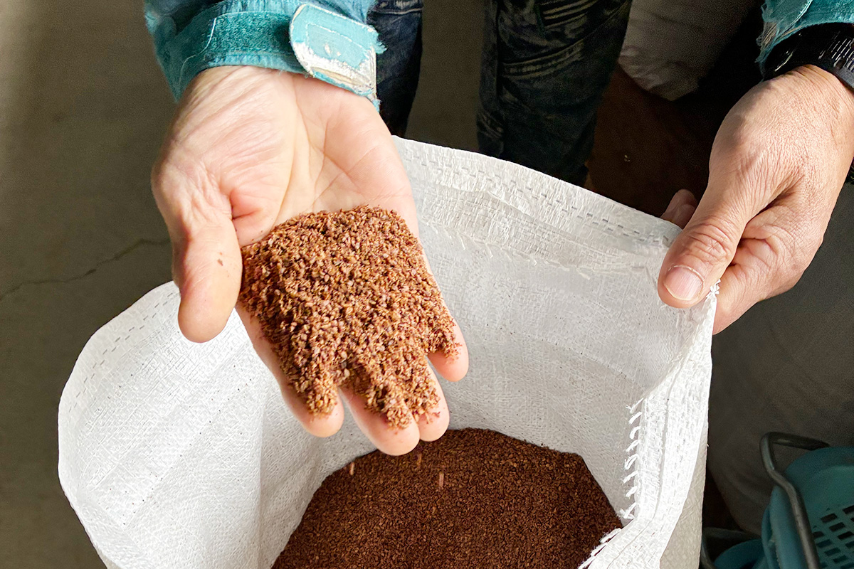 一番搾りのごま油かすは、タンパク質や油分などの有機成分が豊富に残り、ゆっくりと効きながら土をふかふかに育てる高品質な有機質肥料になります。